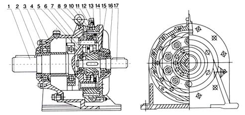 1.輸入軸2.擺線輪3.轉臂4.輸出軸5.針齒殼 |
