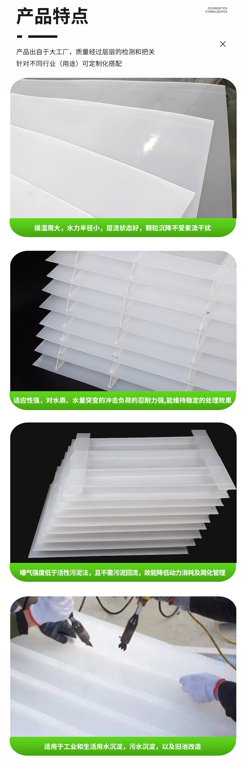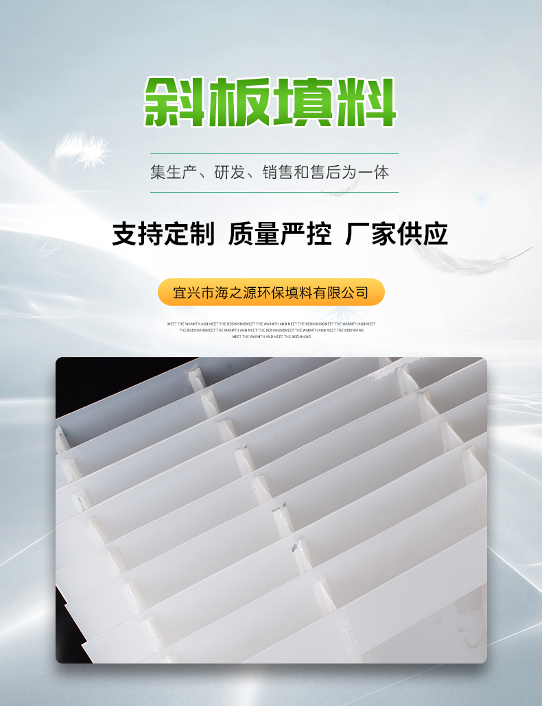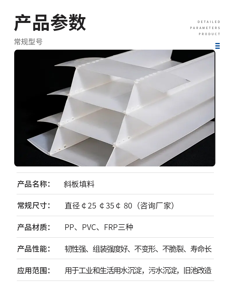 斜板填料、乙丙共聚斜板填料、小間距斜板填料主要由乙丙共聚材料加工制成。在淺層理論的基礎上,在斜板上部設置沉淀距離合理的沉淀段,在下部控制斜板的幾何形狀,使斜板下部形成穩定的接觸絮凝段,通過接觸作用和淺池沉淀機理達到礬花與水分離的目的。